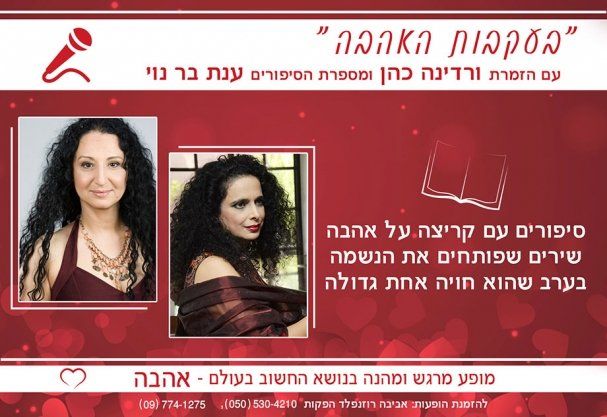 ורדינה כהן זמרת ממשפחת סולימן הגדול ז"ל וענת בר נוי בת דודתה של ורדינה כהן (משפחת גמליאל) במופע של סיפורים ושירים שנכנסים אל הלב ומעוררים מחשבה על אהבה וזוגיות. אהבות גדולות, אהבות היסטוריות, בגידות ועוד...